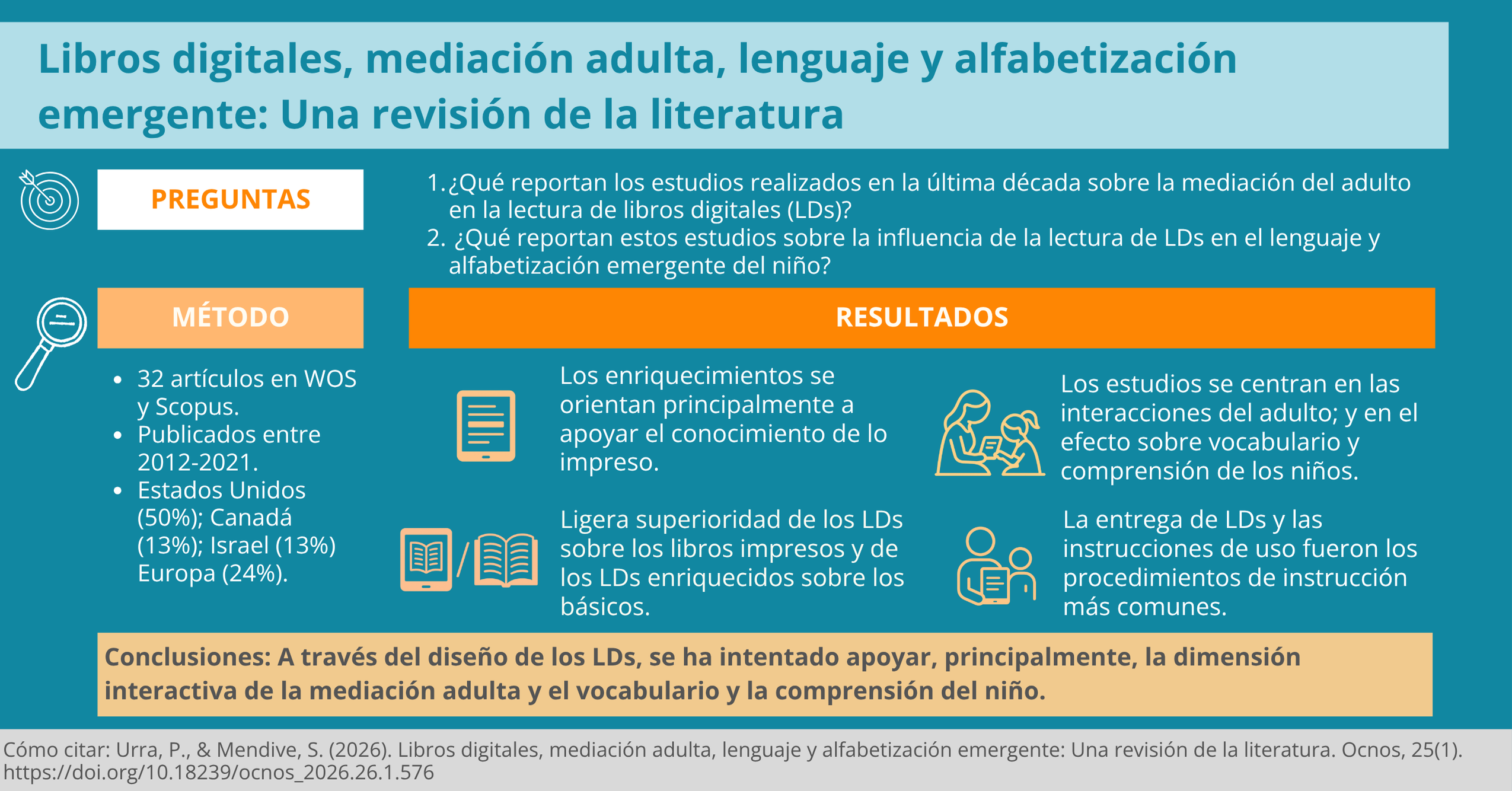 Urra, P., & Mendive, S. (2026). Libros digitales, mediación adulta, lenguaje y alfabetización emergente. Una revisión de la literatura. Ocnos, 25(1). https://doi.org/10.18239/ocnos_2026.26.1.576