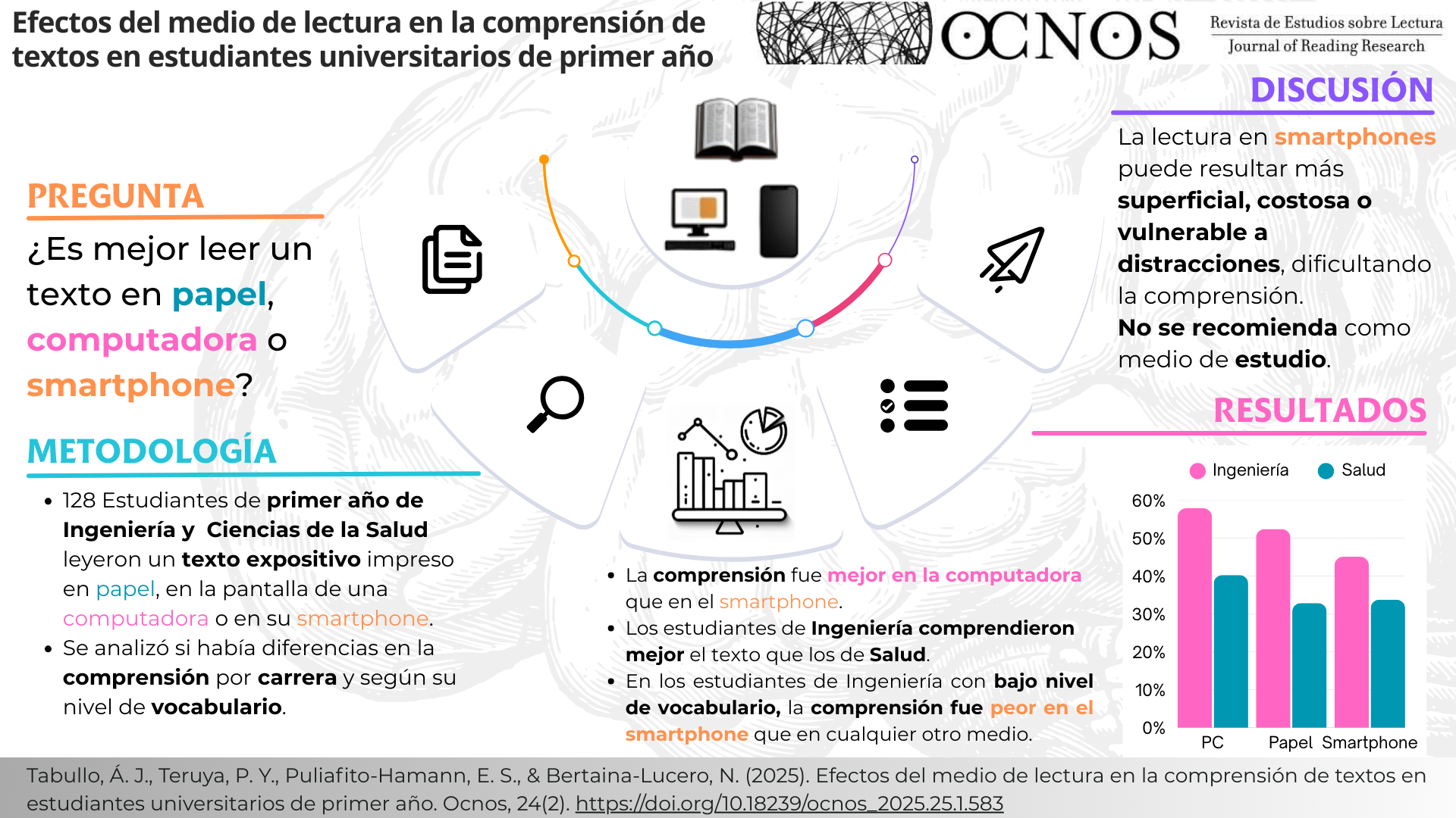 El estudiantado universitario argentino enfrenta dificultades en la comprensión de textos. A pesar de la popularidad creciente de la lectura en pantallas, la evidencia sugiere que podría afectar negativamente la comprensión. Nos propusimos comparar la comprensión de un texto expositivo leído en papel, computadora personal (PC) o smartphone (smartphone) entre estudiantes de primer año de Ingeniería y Ciencias de la Salud. Asimismo, se exploraron los efectos del campo de estudio, los hábitos de lectura y el vocabulario sobre la comprensión, así como las posibles interacciones con el medio de lectura. Se empleó un diseño experimental, y la muestra consistió en 128 estudiantes (edad promedio: 18,6 ± 2,61 años), quienes leyeron un texto expositivo en una de tres condiciones experimentales: papel, PC o smartphone. También se evaluaron su vocabulario y hábitos de lectura. La comprensión fue menor al leer en smartphone, comparado con la PC. El estudiantado de Ingeniería con menor nivel de vocabulario obtuvo peores resultados al leer en smartphone que en PC o papel. A su vez, Ingeniería tuvo mayor comprensión en todos los medios de lectura, lo cual no pudo atribuirse únicamente a su vocabulario ni a sus hábitos de lectura. Estos resultados sugieren mayores costos cognitivos, distracciones o una menor profundidad de procesamiento durante la lectura en smartphones. La ventaja observada en Ingeniería podría explicarse por diferencias en su trayectoria educativa o en sus habilidades cognitivas.