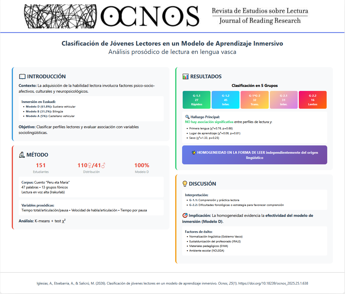 Con información obtenida en la lectura en voz alta de un texto narrativo en lengua vasca se ha clasificado a 151 jóvenes universitarios en perfiles lectores y se ha evaluado la asociación entre estos perfiles y variables sociolingüísticas. La clasificación K-mean basada en seis variables prosódicas (tiempo total de lectura, tiempo de articulación, tiempo de pausa, velocidad de habla, velocidad de articulación y tiempo por pausa) ha proporcionado una clasificación estable en cinco grupos. La caracterización cuantitativa de los perfiles ha revelado un gradiente desde lectores rápidos con pausas cortas hasta lectores lentos con pausas más largas y numerosas. El análisis mediante tablas de contingencia no ha mostrado asociaciones significativas entre los perfiles de lectura y las variables categóricas estudiadas (primera lengua, ámbito de aprendizaje del euskera y sexo). La homogeneidad observada en la forma de leer, independientemente del origen lingüístico, ha evidenciado la efectividad del modelo de aprendizaje inmersivo. Este planteamiento metodológico es reproducible con otro tipo de textos, con lectores en otras etapas de aprendizaje y en otras lenguas. También permite contrastar resultados entre modelos educativos.